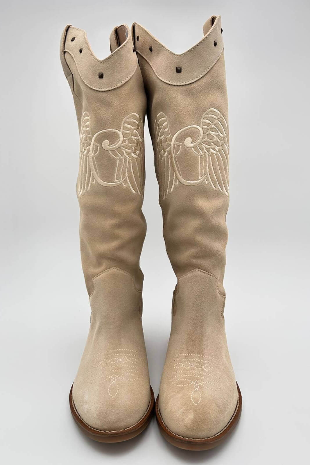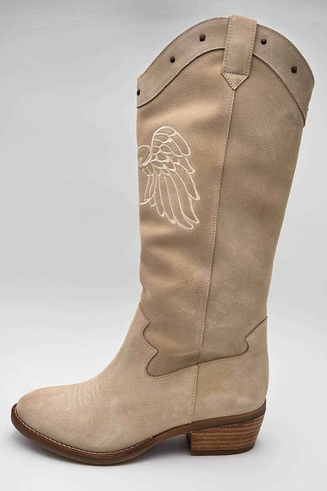 Bota estilo cowboy en color beige, con punta redondeada, bordado del logo de Camaleónica en la parte delantera en beige y caña decorada con tachas.