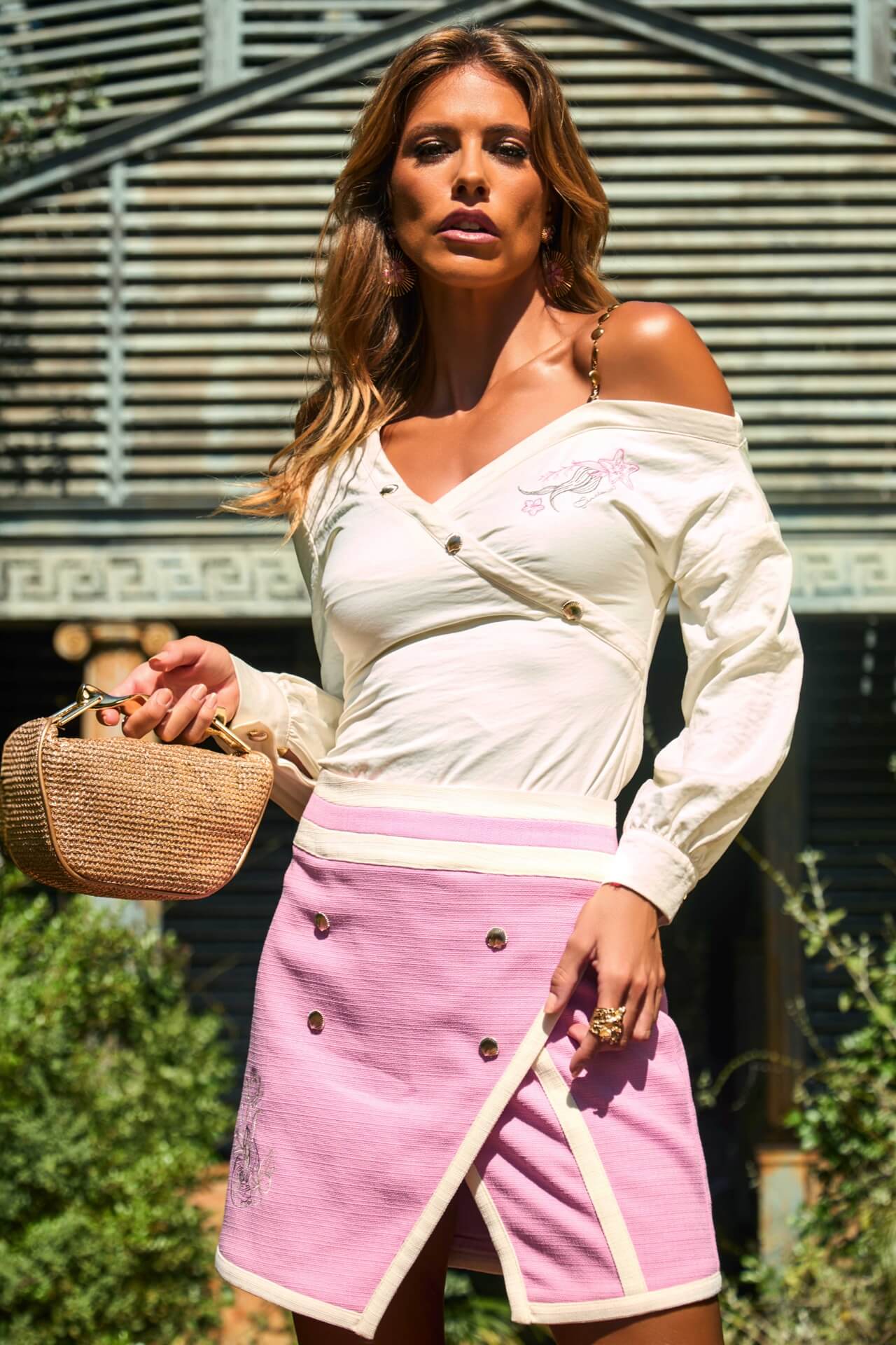 Falda corta, en color rosa con detalles en blanco roto, en tejido texturizado. En la parte delantera lleva como botones unas conchas en color dorado, y lleva bordado en un lateral un dibujo de temática marina en hilo blanco y marrón. Lleva una pequeña abertura en uno de los laterales. Se cierra con cremallera dorada en la parte trasera.