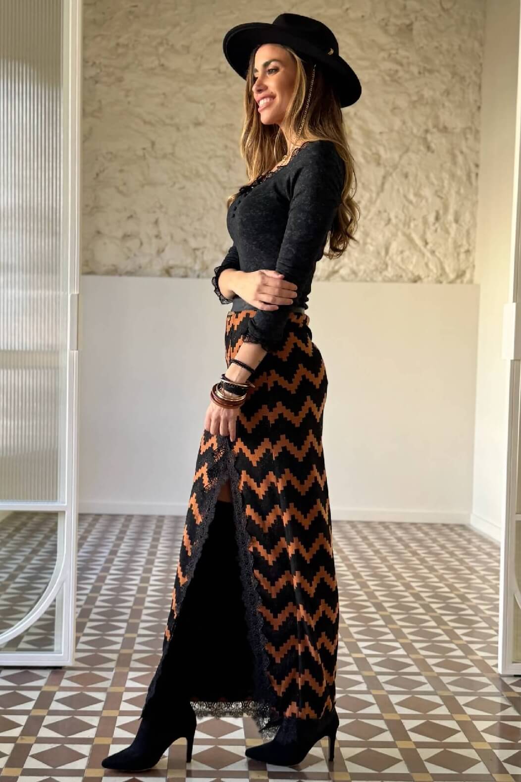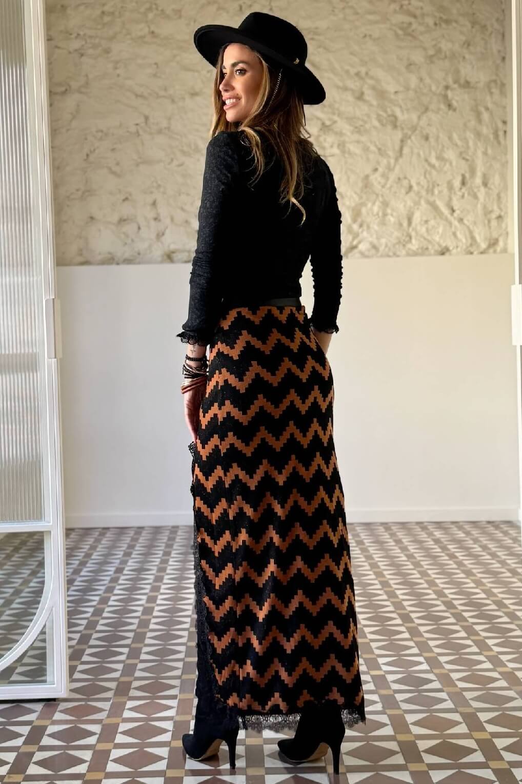Falda larga con estampado geométrico en color negro y teja con detalles de purpurina. Abertura lateral y bajo con detalle de puntilla. Cintura de ecopiel negra. Cremallera invisible en un lateral.