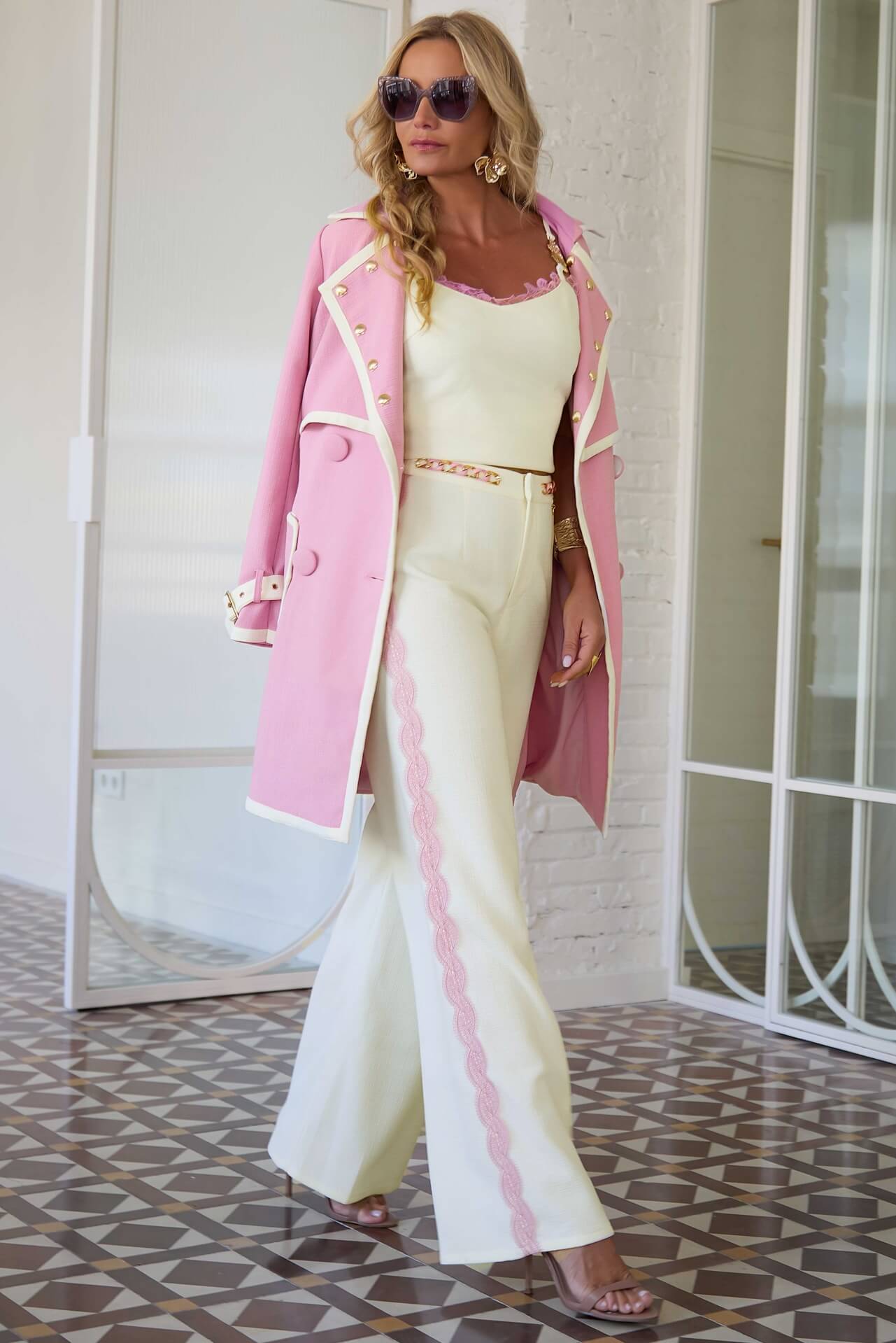 Top corto, de color blanco roto, entallado, de tejido texturizado. Los tirantes son finos y regulables, con puntilla de color rosa bordeando la parte del pecho. El tirante lleva detalle de las alas en dorado. El escote hace forma de pico, y la espalda lleva bordado el logo de la marca en hilo. Se cierra con cremallera invisible en el lateral.